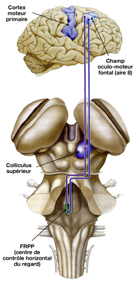 De leur côtés, les neurones du champ oculomoteur frontal (aires de Brodmann : 8) projettent ses neurones sur le colliculus supérieur ipsilatéral qui, lui-même, envoie ses neurones sur la FRPP (contrôle horizontal du regard) et le noyau interstitiel rostral controlatéral (contrôle vertical du regard).